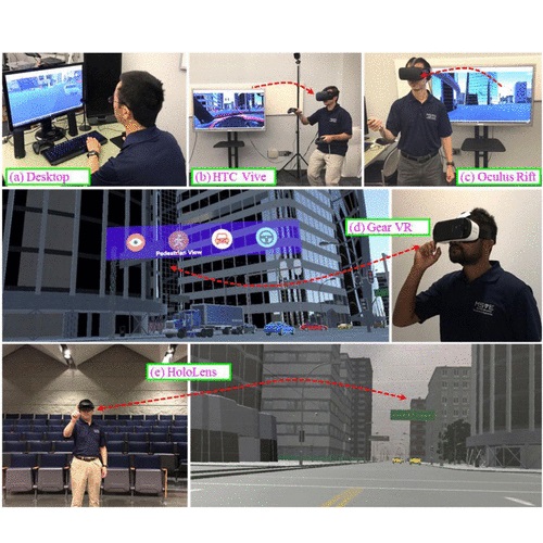 Abstract : Full comprehension of microscopic traffic simulation (MTS) models has necessitated the development of proper visualizations. Existing MTS models only provide limited capability of two- and/or three-dimensional displays that often restrict users’ viewpoint to a flat screen. Their downscaled scenes neither provide a realistic representation of the environment nor allow different users to simultaneously experience the simulation model from different perspectives. This largely prevents analysts from effectively demonstrating and disseminating their simulation results to various stakeholders of different background and knowledge. In light of these issues, this paper aims to develop a framework that enables a multi-user, multi-perspective, and multi-mode (M3) visualization architecture for microscopic traffic simulation. The proposed framework is empowered by the latest advances in cloud computing and virtual reality (VR) to support interactive and immersive visualization for simulated traffic environments. A client-server architecture allows multiple users at distributed physical locations to view the same simulation from multiple perspectives simultaneously and supports a variety of virtual/augmented reality devices. A prototype of the proposed M3 visualization framework is implemented and demonstrated by simulating and visualizing a model of typical traffic operations in a high-density urban area. The promising capability of the M3 visualization framework is attested. Potential improvements over the present study to further excel current visualization framework are also discussed.